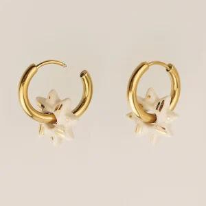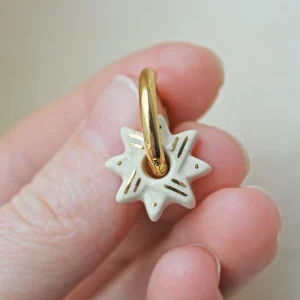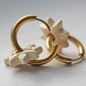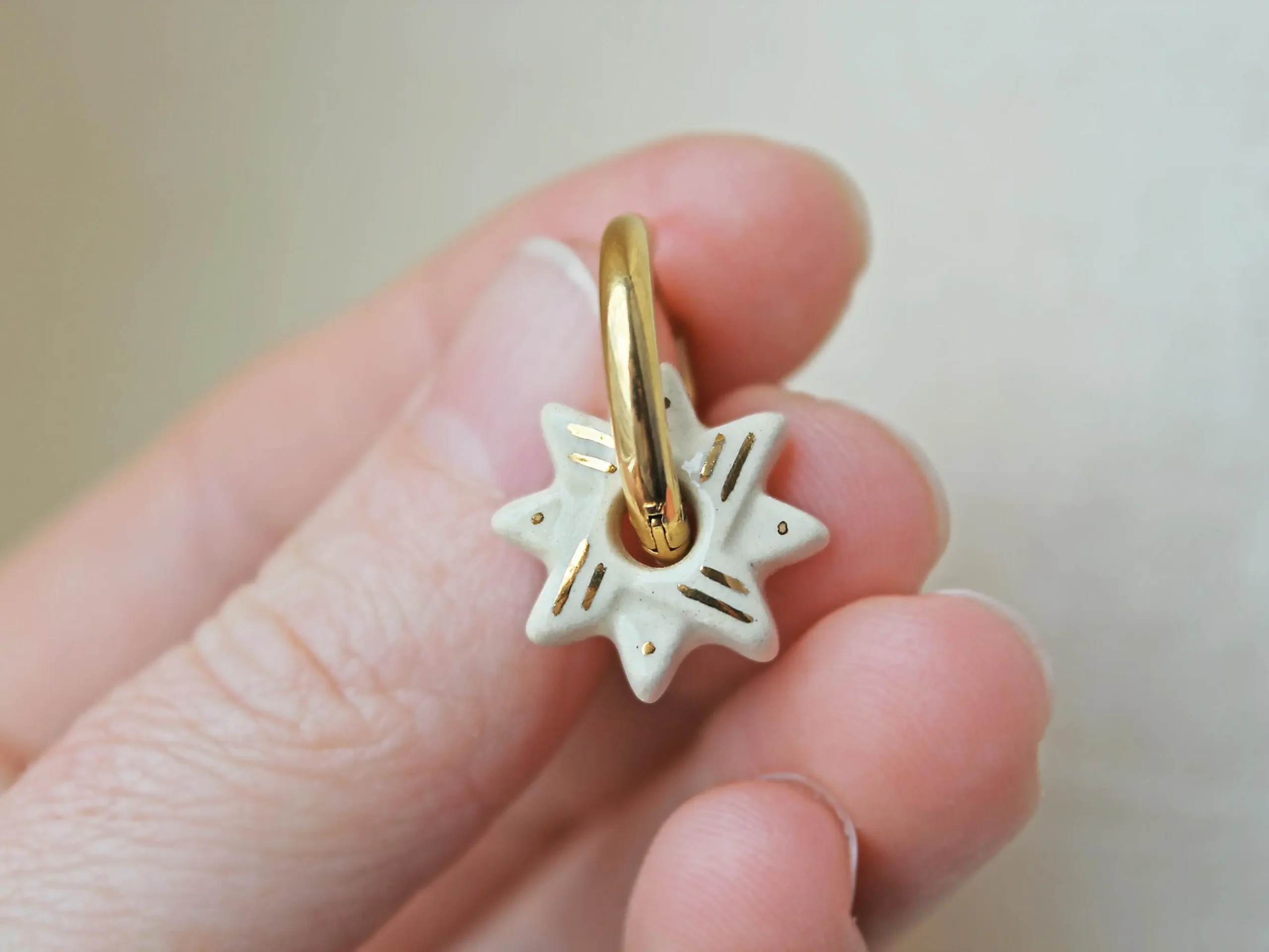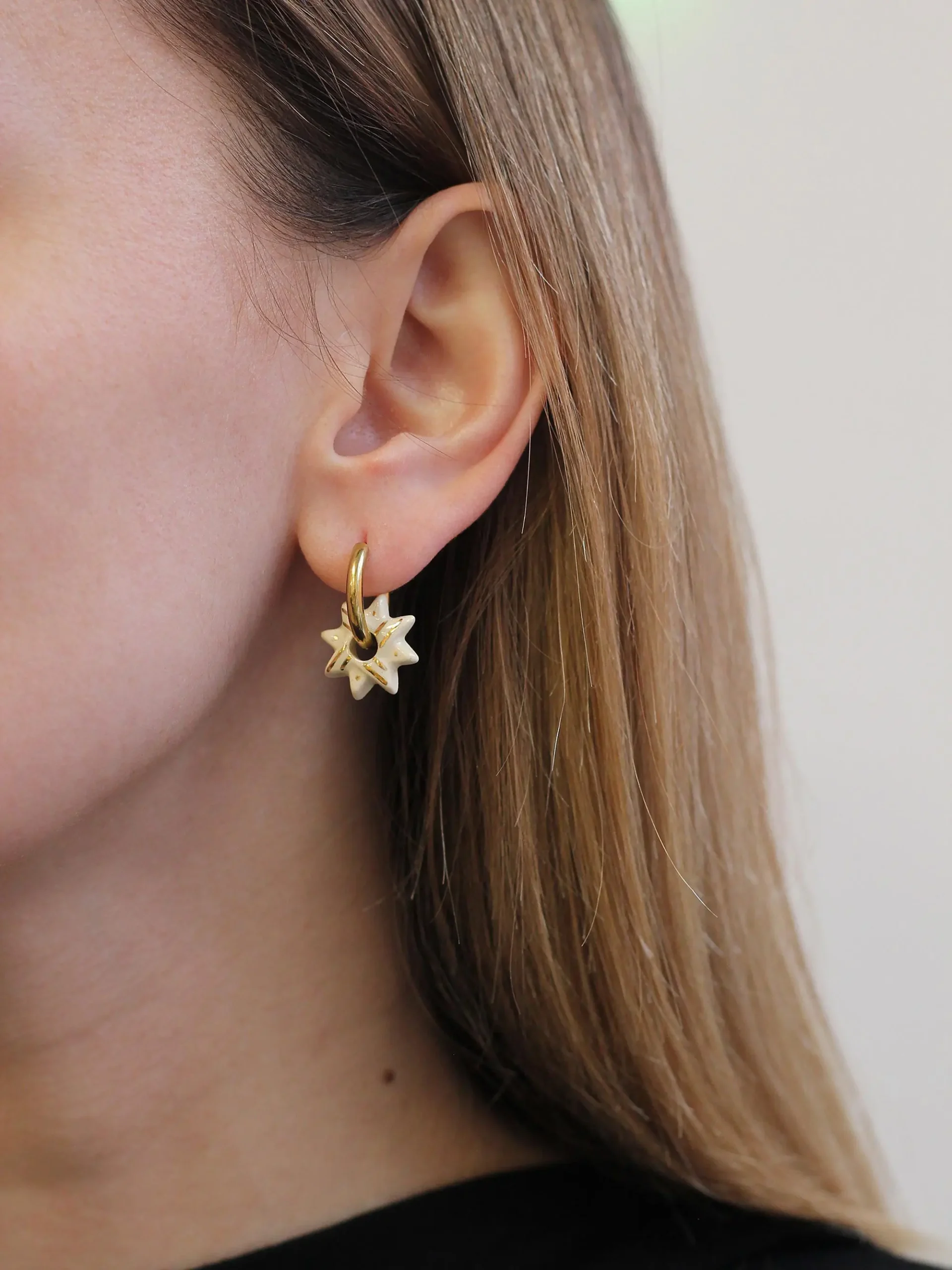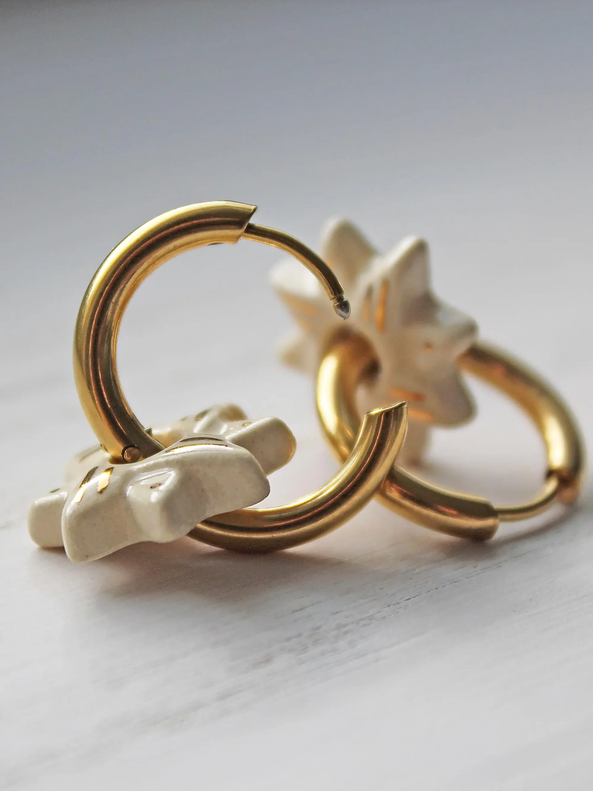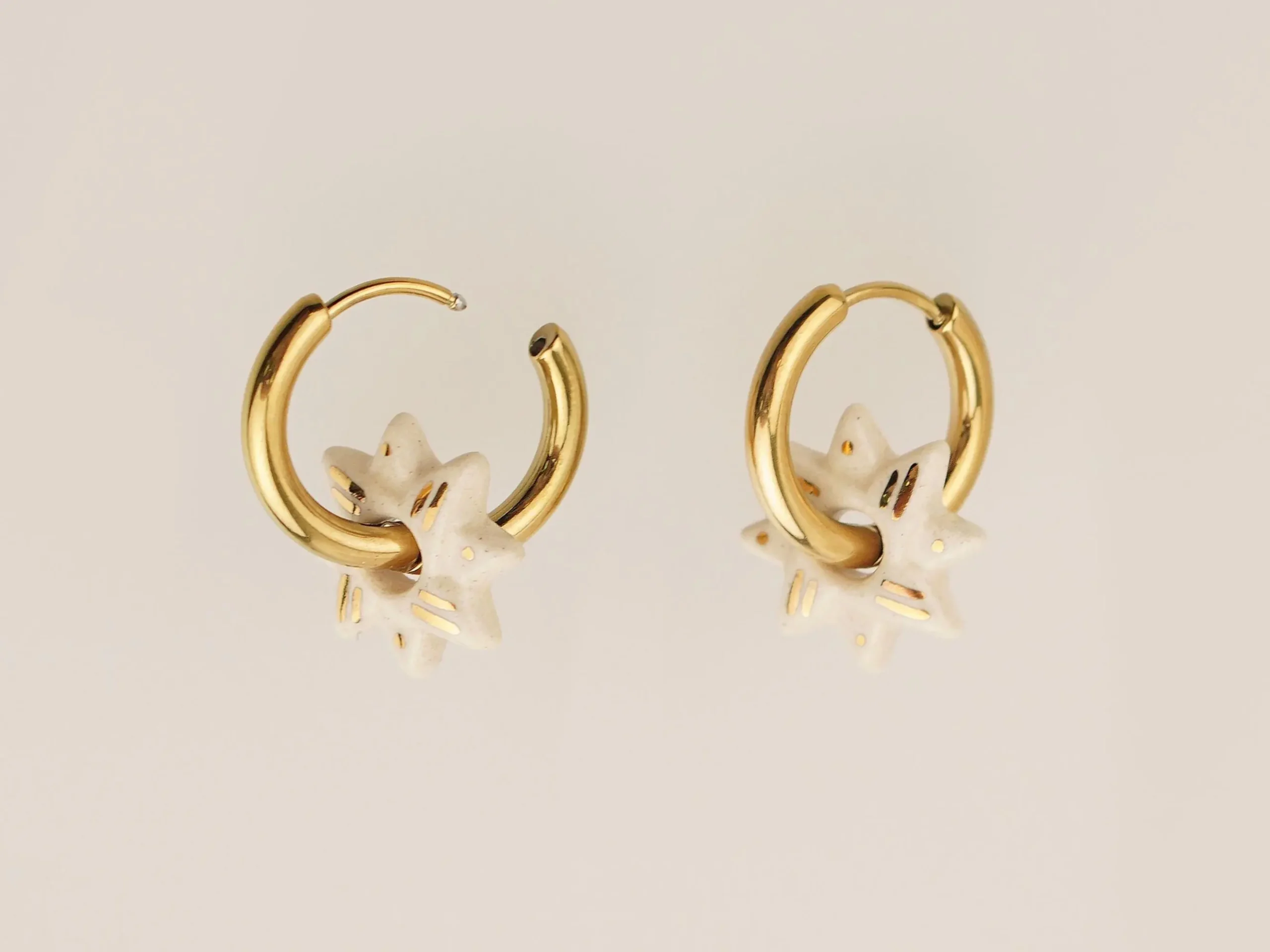 Enhance her special day with our Celestial White Star Hoop Earrings. Handcrafted from ceramic, these dainty hoop earrings are perfect for a special day. Their elegant design combines delicate star beads with a refined hoop style, making them an ideal choice for a bridal look or any special occasion.