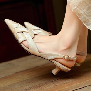 Step into elegance with these women s genuine leather slingback sandals. Featuring a narrow band cross strap design, pointed toe, and low kitten heel, they offer chic style and all-day comfort. Crafted with premium split leather uppers, soft sheepskin lining, and insole for a luxurious feel. The open side vamp and secure buckle strap back add modern flair, while the rubber outsole ensures stability. Perfect for summer dress occasions, these gladiator-style sandals fit true to size and include a subtle 0 3 cm platform for added lift.