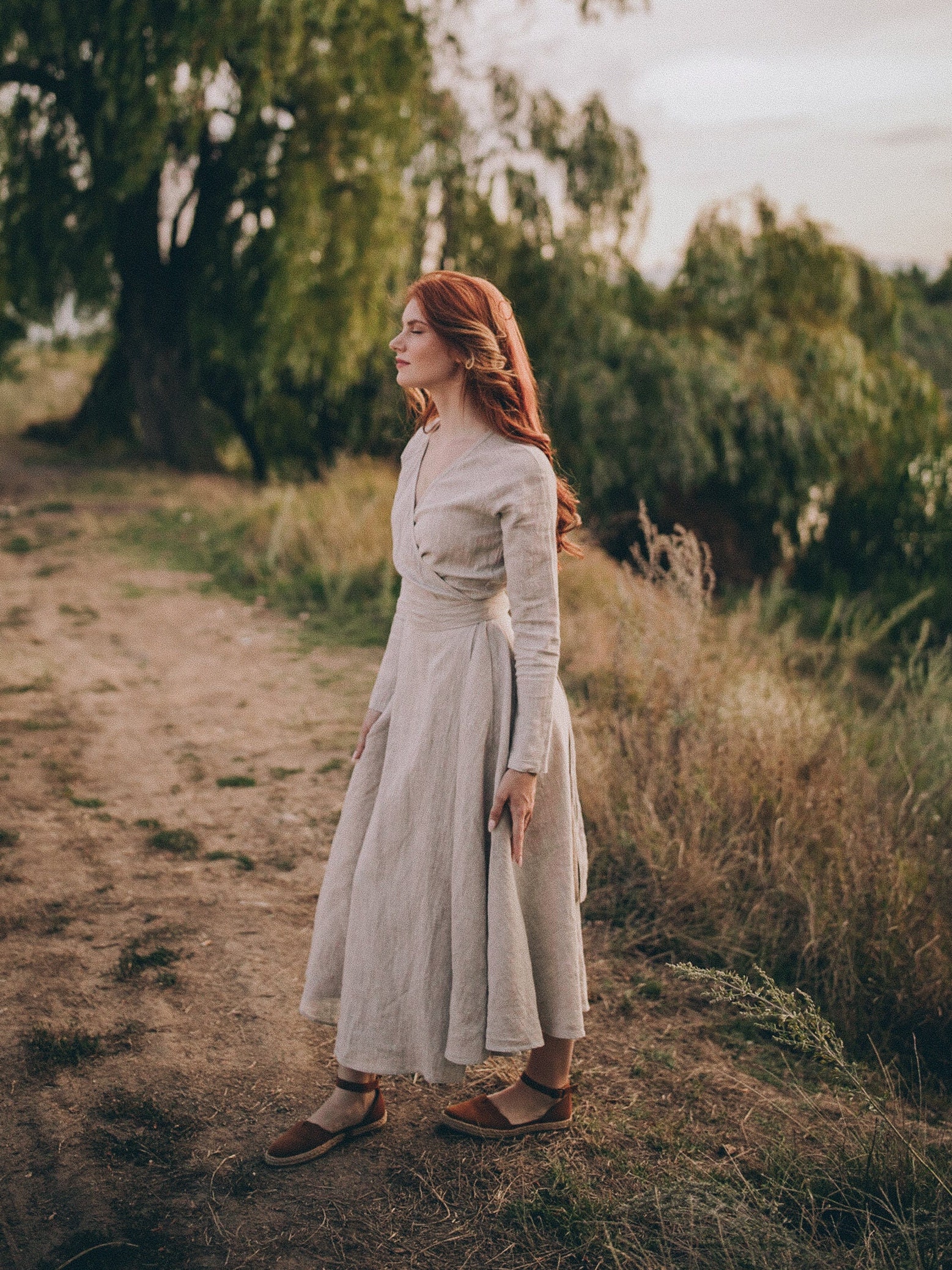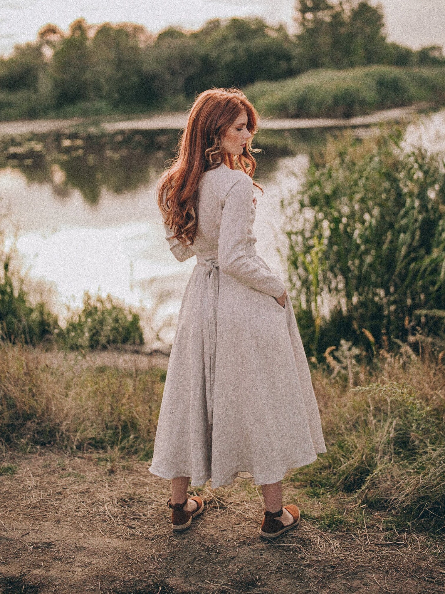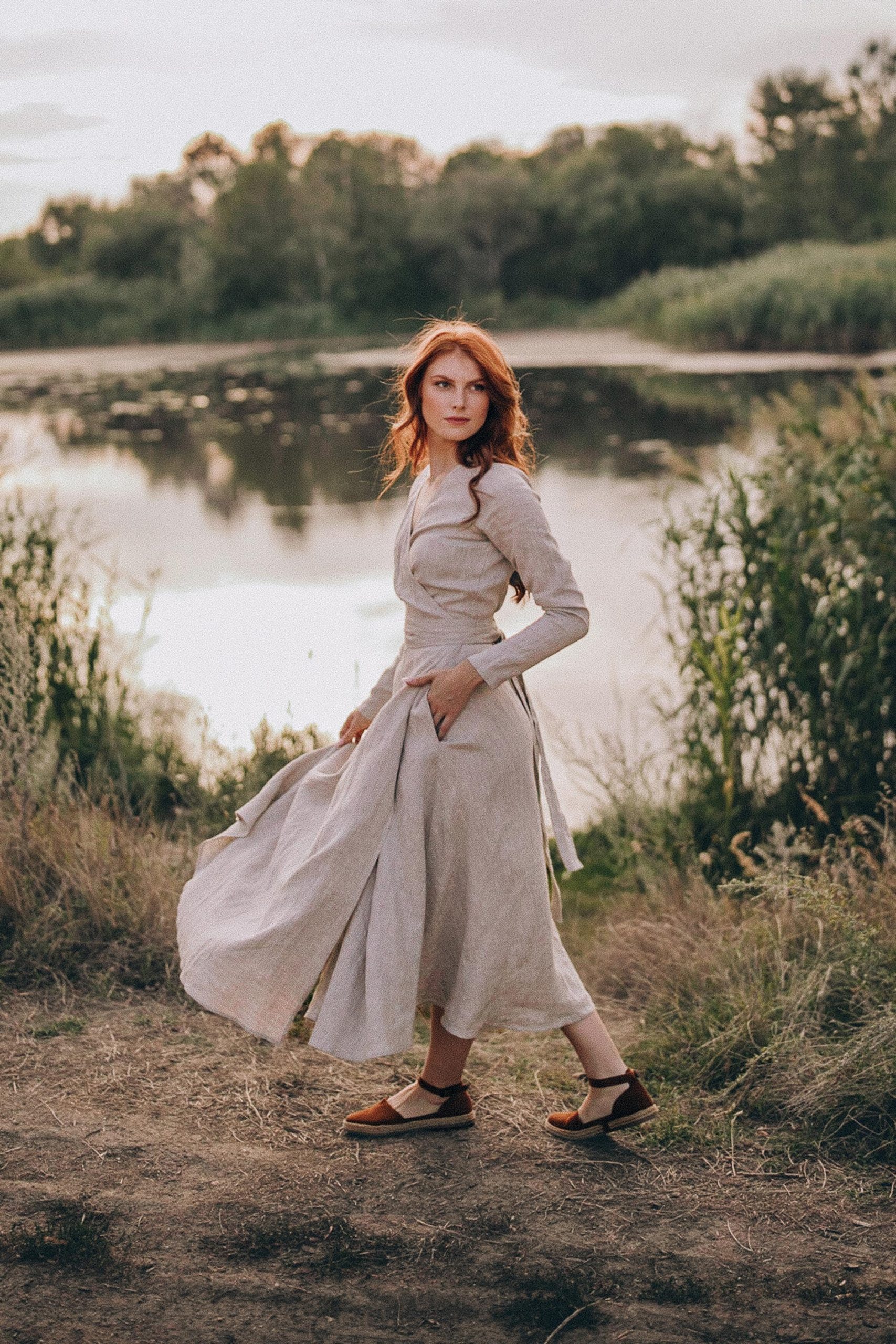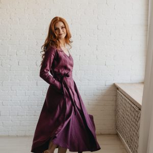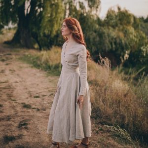 Embrace timeless style and comfort with our midi linen dress, designed for effortless elegance. Made from luxurious heavyweight linen, this dress offers a perfect balance of structure and flow. Featuring a flattering V-neck collar and a tie waist, it creates a beautiful, adjustable silhouette that suits any body shape. The midi length adds a classic touch, while the convenient side pockets make it as functional as it is stylish.