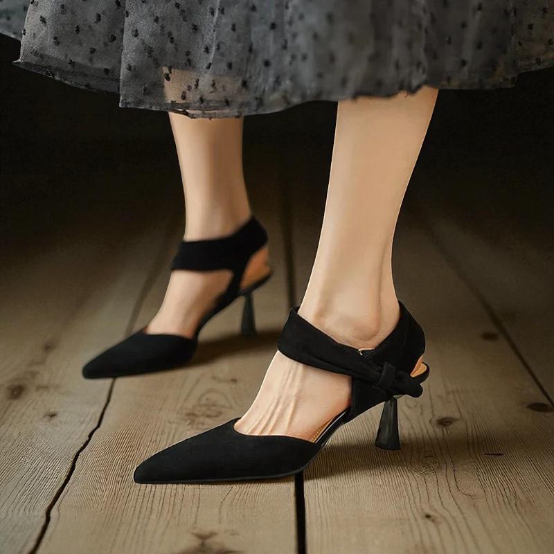 Step out in confidence with these women s kid suede pointed toe sandals, designed with a chic ankle strap and stylish thin 6.5 cm heels. Featuring premium full grain leather insoles and a soft genuine leather lining, they offer elegance and comfort for the office or any classy event. The open side vamp and secure buckle closure add a modern touch, making these sandals perfect for professional or evening wear.
