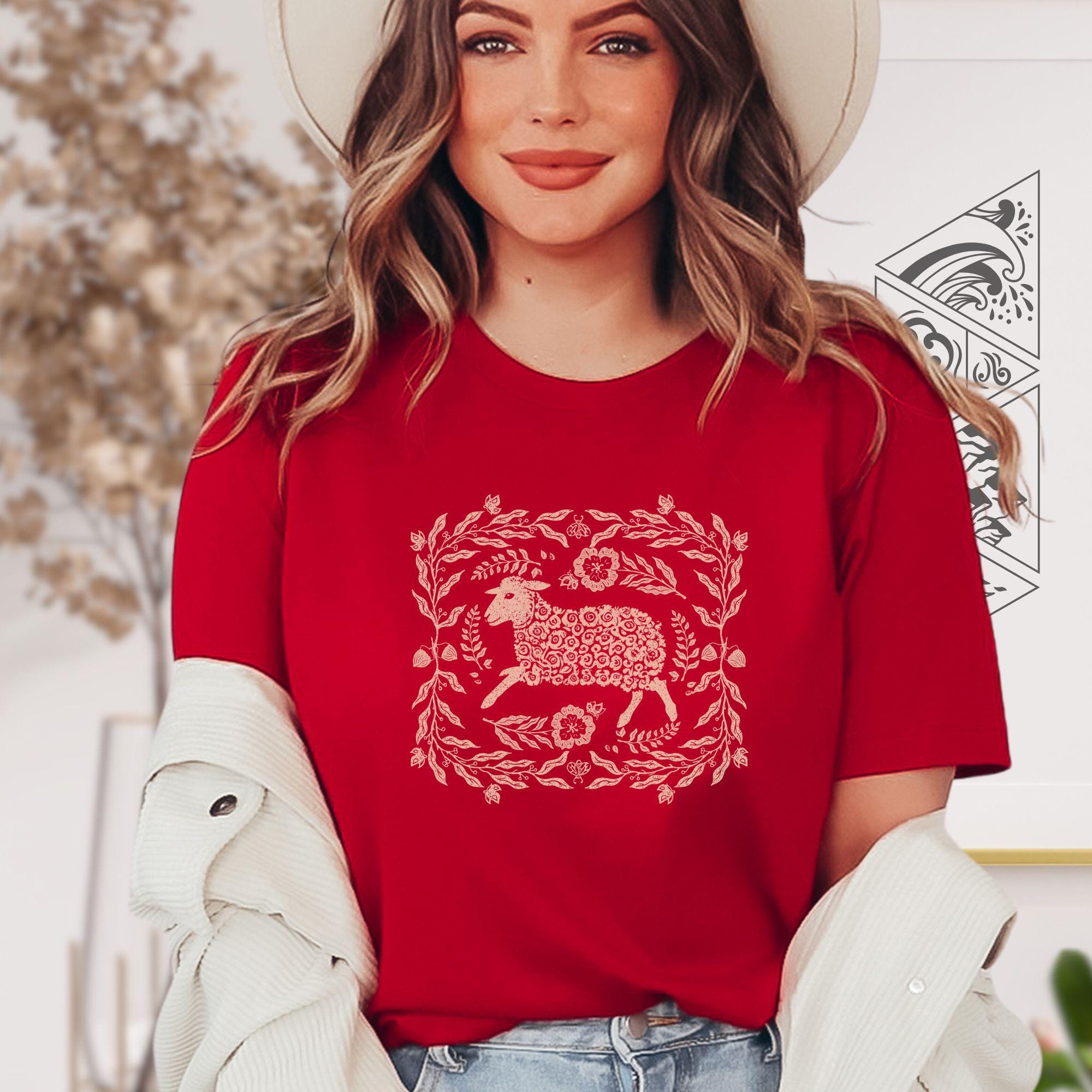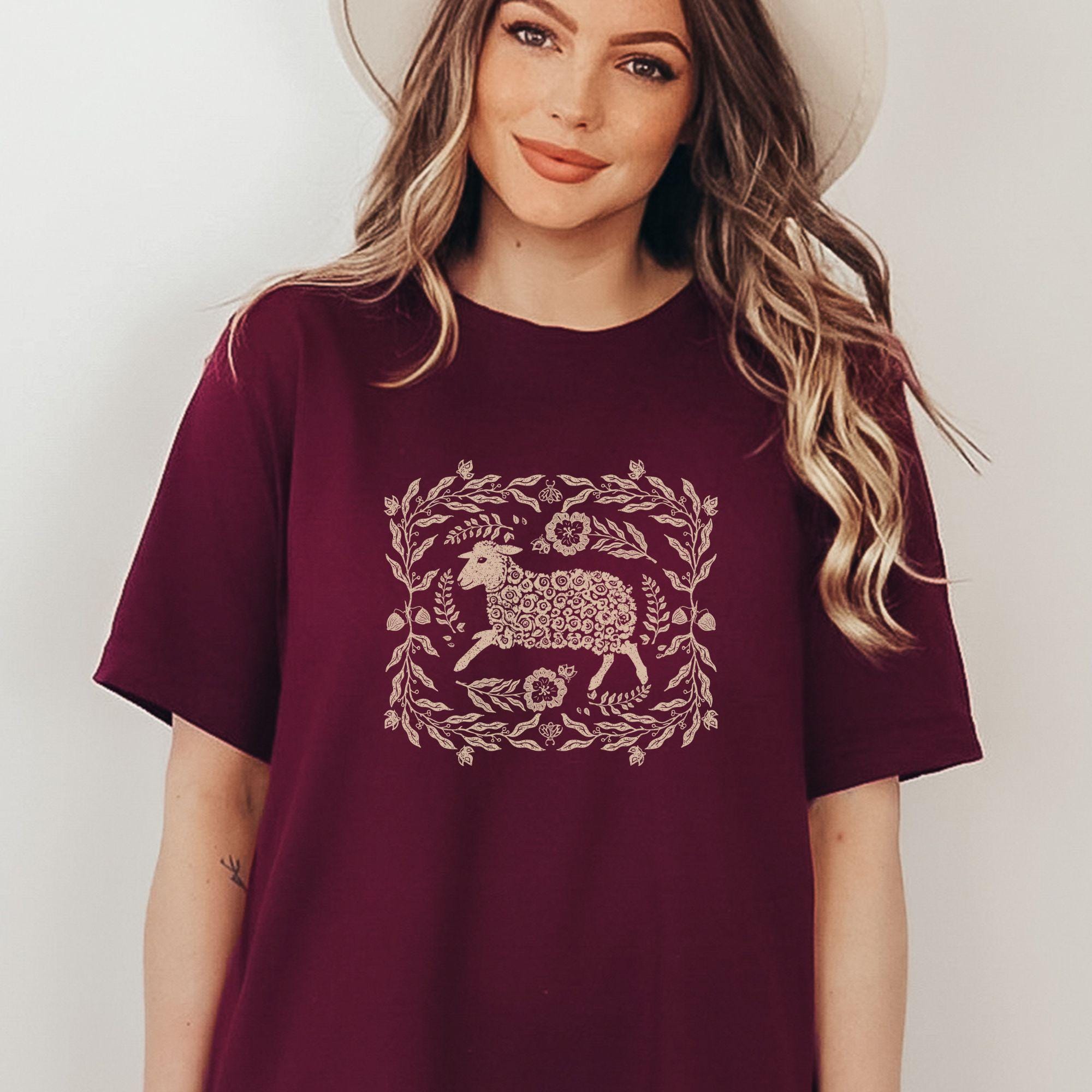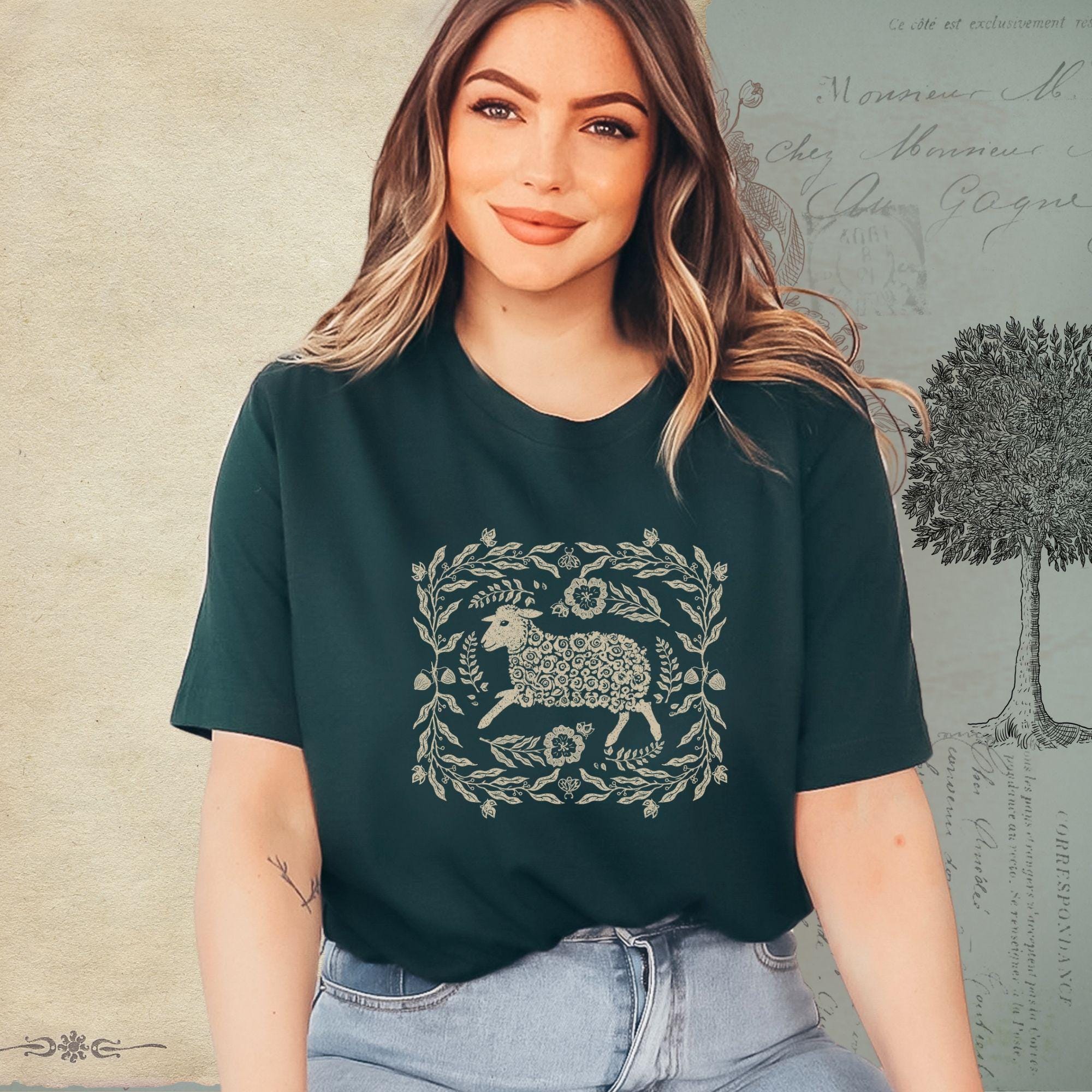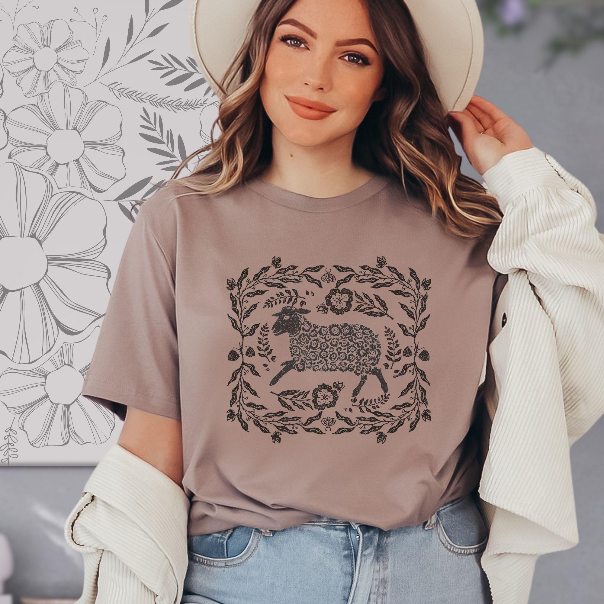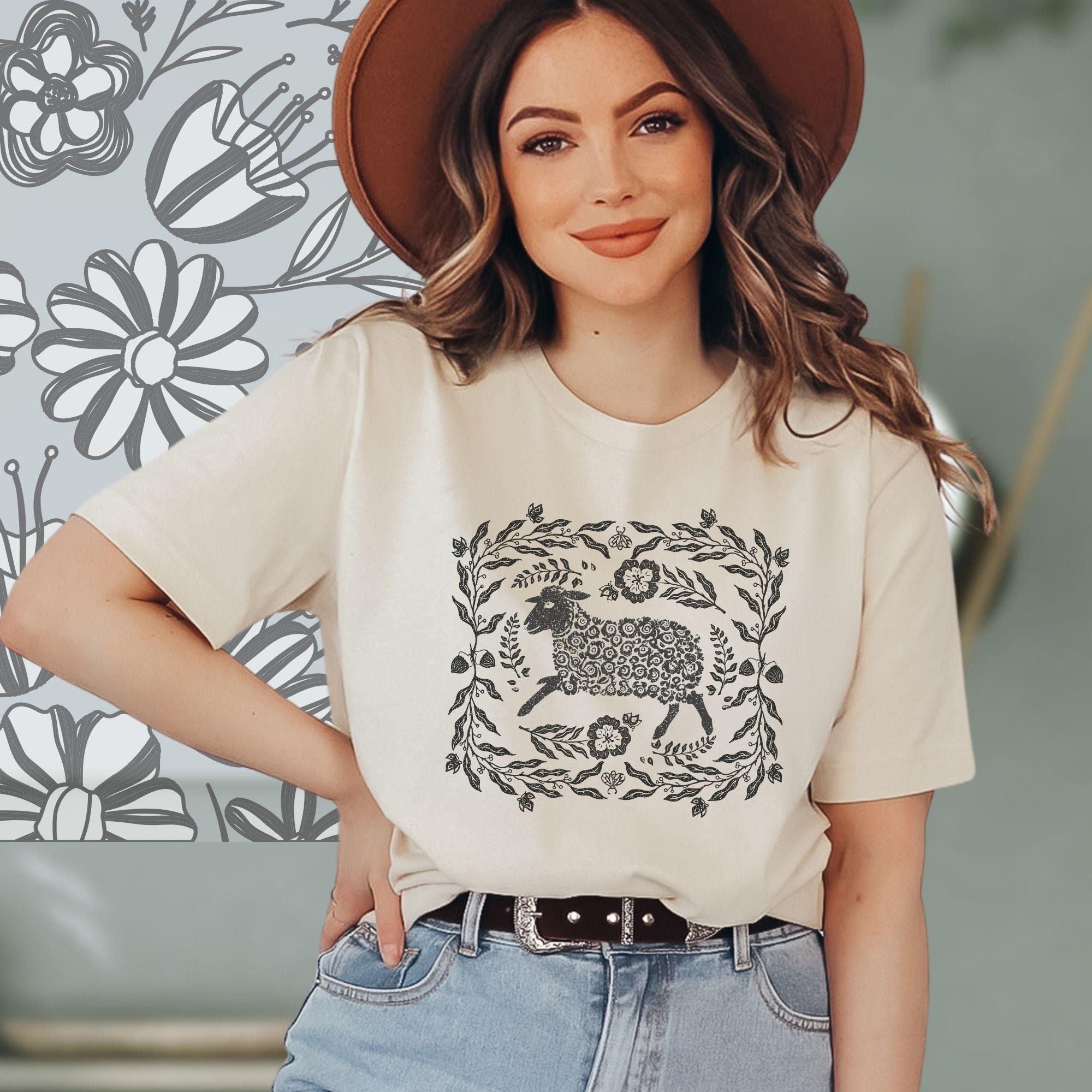 Vintage Linocut Sheep T Shirt Floral Animal Design